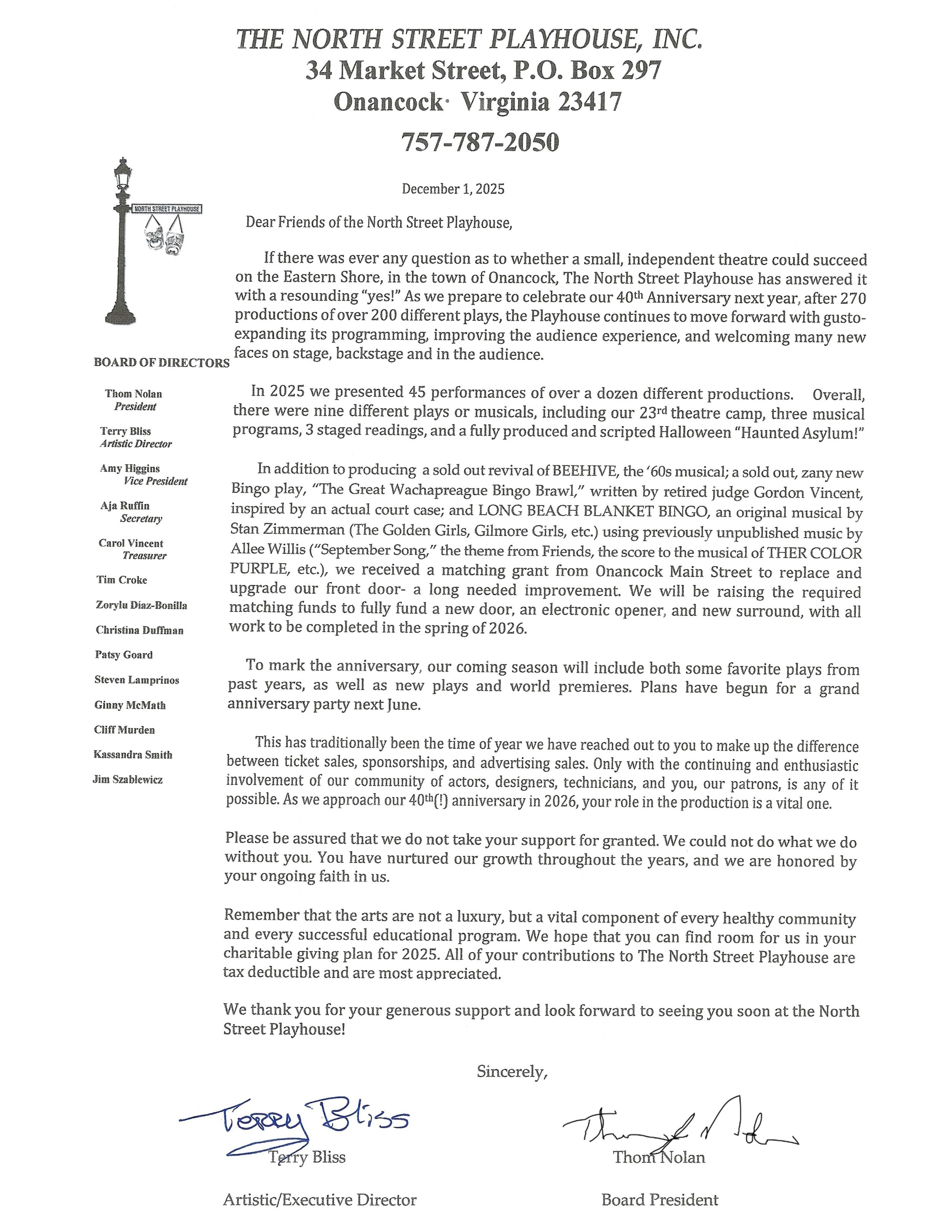 Checks: please make payable to North Street Playhouse